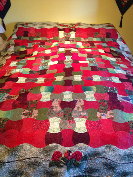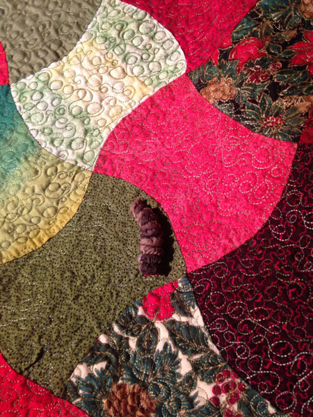AM: Well, off and on, because I didn’t make it all in the one go. Um, I would start it probably about ’95, 1995, something like that. But I don’t think I finished it… uh, that would be machine quilting. There’s a lot of machine quilting on it, because it’s done in wormy holes all over [laughs].