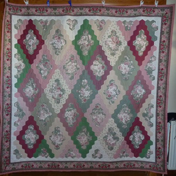 EL: No I found them as I went along, you know. I was like on a mission. I couldn’t walk past a fabric shop or a market without seeing if I could get something else to go with the quilt. There is another fabric in there that I found in the Lake District. We happened to come upon a patchwork quilting shop up in Cumbria. So I bought [AE: as you do on holiday] half a metre of fabric there which happened to go with the colours in the quilt, and then the border erm was I think it was a Jinny Beyer fabric because there was a shop in Pinner called Artisan [AE: right] and although it was primarily embroidery, erm, she, the lady Beryl who owned the shop, she stocked a few patchwork fabrics and it grew and then she invited Jinny Beyer over for a lecture and I went to the lecture and there was some fabrics for sale and I saw that pink rose fabric and I thought that would work great as a border, though when I got it home it was too stark. It really jumped out of the quilt and I wanted more of a shabby, subdued effect that looked a bit like an antique quilt, so I thought oh, big mistake. But then I flipped the fabric over, perfect!