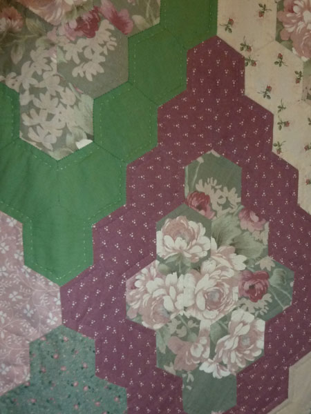 EL: Well the more I think about it, you know, a lot of her is in it, a lot. She never had the chance to be creative though. In fact the Christmas before she died, I said to her ‘Mum, what do you want for Christmas?’ and this was before I started doing patchwork quilting, this was in 1984. And she said I’ve seen some cushions with hexagons on and so she said ‘I quite fancy something like that’. And I thought she meant a hexagon shaped cushion, you know a six sided cushion. Not with hexagon patchwork on it, I didn’t really understand and she couldn’t convey to me what she had seen. So I went all over the West End, I went to DH Evans in Wood Green looking for hexagon shaped cushions and I never got the cushions. So I ended up getting her, I can’t even remember, I think it was some pottery and she looked very disappointed when she opened it because she really wanted these blooming hexagon cushions. And then she died two weeks later, and when I eventually did start patchwork quilting I think I was drawn to hexagons because I had that in my brain. And in a way that Shabby Roses quilt is the quilt I was never able to make for my Mum.