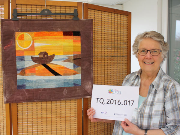 Kathy’s ‘After the Flood’ wallhanging quilt was made for her grandson. It is her own design, inspired by Danish artist Ton Schulten, hand pieced using silk velvet and free motion quilted. Later Kathy talks about her quilting heritage, how she was introduced to quilting by her friend, Ineke Berlyn, and making her first quilt. She also discusses dyeing fabric and her reluctance to exhibit her quilts.