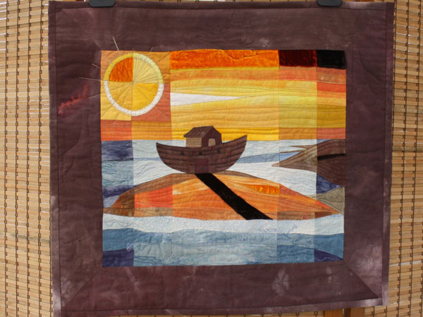 KH: Well, I would think it would classify as a small wall hanging. It’s 21 and a half inches wide by 20 inches high and its title is After The Flood. I made it in 2004 for my grandson; he was the first gran… my first grandson who was born. His name is [Evan] and I made it for him and eventually finished it and gave it to him either for his first birthday or for Christmas in 2004. His birthday and Christmas are only a few days apart so, it was one or the other and I can’t really remember which one it was, ’cause it’s a long time ago. It’s basically a scene, with… I… it started out as a Noah’s Ark and I got carried away with the design and I got frightened of the difficulty of stitching animals onto the scene and everything. So I ended up making what I considered to be quite a quirky take on Noah’s Ark and it doesn’t really look like a traditional Noah’s Ark at all. The Ark is a primitive, primitively drawn boat wi… that’s just basically a semi-circle that looks like it’s a very… like it’s perched on top of a hill. And the hill is surrounded completely by water, and there’s a sky scene ab… above it, which included a very large and very bright sun. I presume the hill was meant… in my thinking, was meant to be Mount Ararat and the boat is, is the Ark. And there are no animals in the Ark I th… it looks like they’ve left. And there is a pathway down from the boat leading… into the water really. I chose this style because I had been taken to Holland… I went to Holland with Ineke Berlyn who’s Dutch, and who’s quite a well-known quilter now, in, in the few years before that. And Ineke was very taken with this Dutch artist called Ton Schlor… Schulten… I can’t say the name in the way Dutch people do. He works in a place called Ootsmarsum in Holland and we went to his gallery. And Ineke had been looking at his landscapes because they’ve… because of the way they’re done, they’re very suitable for making into a patchwork. And my very first attempt at anything like this was a wall hanging which was just a copy of one of his pictures. And… it taught me the techniques of how to put it all together and everything. I then did another one, which was also pretty much a copy of his pictures. And when I came to do this one, I drew this myself and did the design. But I used the same techniques and the same style that come… that are in his landscapes. Their fea… one of the features of his landscapes are very primary colours. And they always… they look to me like there’s a sort of window, with almost like a net curtain on either side, or a curtain that’s been opened. And the picture gets brighter as it goes toward the middle. And the edges of the pictures, the colours are slightly darker shades. And it kind of looks like you’re looking maybe through a net or something like that. As… and then you focus onto the centre of the landscape. And I rather liked that, and I wanted to, I wanted to try and create it for myself.