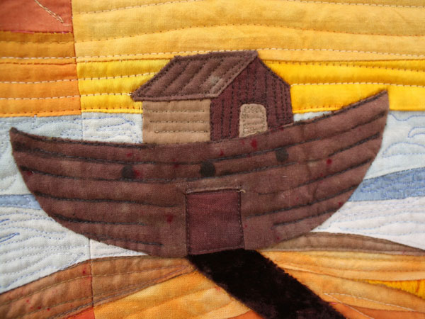 KH: It’s, it’s all… it is all hand pieced. I think that it’s such a long time ago, it’s really quite difficult to remember but, I, I rem, I remember having a picture, drawn out with the colours I wanted to use in it. Not… and it took me a long time to collect together all the different shades and depths of colour that I wanted. And when I finally had it, I, I can remember using raffle tickets to number the pieces so that they went together in the right order and in the right lines. And it was worked in [counts] one, two, three, four, five strips and each strip was made with… sorry, I’m working from the outside toward the centre, along the height of it. And I would make a strip, and then the next strip would be very nearly the same colours but in a slightly lighter shade. And then the middle, the strip is quite wide and it looks as though I have applied the Ark on top of the background. But I, do you know I really cannot remember whether that’s exactly what I did or not but it… that’s what it looks like to me, it looks like I pieced the whole background, and then put the Ark on top if it. And then stitched, stitched round it. Once it was all assembled, it is then quilted. The sky itself is, probably been quilted with a walking foot because the stitching is very straight, and there aren’t very many wobbles in it or anything. And it also looks to me like the stitched length has been regulated. The… where there’s water, has been free machine… free motion quilted using a sewing machine obviously. And there are areas where there are, what do you call them, bubble, like circle, circles which look a bit like foam or bubbles or something like that. There are also a sort of zig zag lines that look like waves or gi, give it texture to make it look like it’s water and, I do think I have achieved that to some extent. Er… that’s pretty much describes the construction of it.