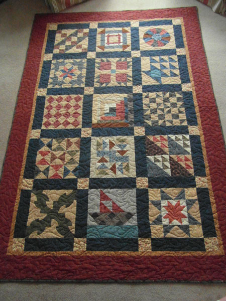 MA: Historically people don’t think that this particular quilt fits the historical background of the Civil war. They don’t believe that certain blocks were used to help the slaves escape to Canada. And there are historical quilters who have designed quilts that they say are more authentic than this particular quilt… but basically it tells the story of how the slaves escaped and how they were helped along the way by people, and the terminology appeared to be all railway terminology. I think there were controllers who led the groups that helped the slaves escape. And there was safe houses and it just appeared to be like a railroad, and escape route. So you have, one block is the Underground Railroad block [JM: Right]. Erm… this one is um… [short stop to gather thoughts] .. the first block is the underground railroad block, the second one is the Monkey Wrench block which signifies the tools that the slaves has to take with them… the next block is the Wagon Wheel block, which is going to aid the slave towards his journey to Canada. The next block is called Jesus the carpenter, and that follows a block called the Bears Trail… well, the Bears Foot the trail of the bear, and that goes through another block which signifies the woods. You then get a basket block and the slave is supposed to have filled his basket with berries and food supplies to go. And then you come to a block which signifies the crossroads and once you get to the crossroads you dig a log cabin, and there’s a Log Cabin block, in the ground for safety. The Shoe Fly block told the slaves to dress up in cotton and satin, with blow ties, so we have a Bow Tie block, because they had to look presentable or they would be noticed. Then they had to follow the Flying Geese and the Birds in the Air, those are two blocks, and stay on the Drunkard’s Path, which is signified by a Drunkard’s Path block. And then we have a sailboat block and they sail across the Great Lakes to Canada. And the last block signifies the North Star which will lead them there to safety.