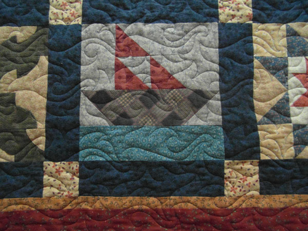 MA: Yes, the quilt is 92 by 62 inches, and because of the size I had it longarm quilted by Sue Phillips in Newport, because I fell downstairs, broke my back and I can no longer move a quilt, or hold a quilt. I can’t do the weight of a large quilt, so any largish quilt I make now, I have it longarm quilted. So I tend to make more lap quilts because then I can cope with that size. [JM: Right.] Lap quilts being something you can just cwtch up into in a chair in the evening and…