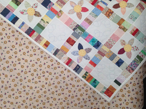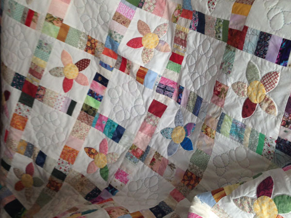 MM: It’s both. There is some machine quilting in the ditch and the um, hand quilting is all round each flower and in every other square.