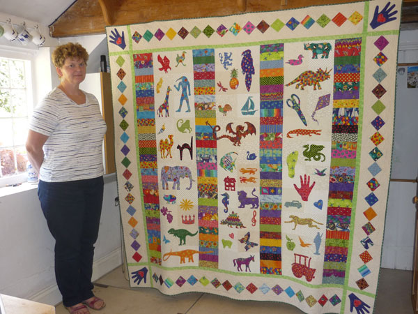 VSB: Um, which I made, er, it’s written on the quilt in, in, in… stitch and I think it’s February 2001. Um, David was nine years old and he was moving from his bedroom to the top floor. We were getting the attics done out and he was going to move up there and nine years old, I felt this was my way, I think, of trying to make him, make it home [interruption] in, in, in the top floor. It is 74 inches square and it’s, um, almost based on the idea of a strippy quilt in the fact that there are, um, four, um, er, six inch wide strips dividing three 11 inch wide strips. The narrower strips are made up of, um, oblongs, um, and the, er, multi-coloured oblongs and the, um, 11 inch wide is a cream background with lots of applique. And the applique is, they are one fabric only. Lots and lots of different colours but, but it’s made up only of one fabric and they’re just shapes. So, you’ve got the donkeys, the butterflies, the lion, the house, um, the dragon, of course, because he was interested in dragons of those days and we’ve got el, elephant there’s, er, dinosaurs he liked.