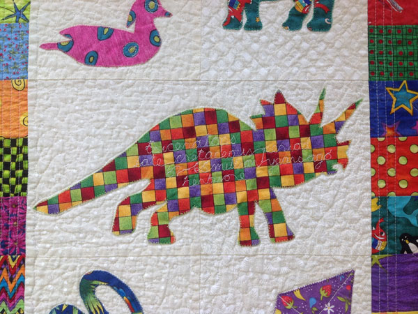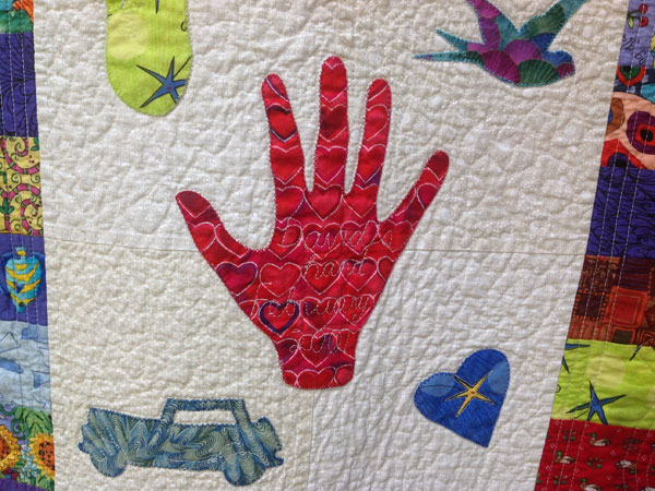 VSB: Er, all different shapes, um, whatever… And also, I put in that, I drew round David’s hand, so that’s David’s hand, February 2001. And that is his sister’s foot. I drew round her foot, Amy’s foot [PH: Yes]. Um, lots and lots of heart fabrics in there to try and show the, the way I was feeling. Um, but also, I, the, the, the cream background is stipple quilted but, um, the bits being held down, apart from being machine appliqued on, um, are quite often have some quilting on to keep them together. It’s supposed to be a very practical quilt this. And, um, so I took the opportunity to write on some of them so David’s hand is written on obvious… And, and the… um… triceratops [PH: Yes], um, which is, it tells me, late Cretaceous period 61 to 65 million years ago. Herbivore. Um, the camel… camels spit I find out. Um, something rather soppy on the eagle. Let your dreams soar. Um, if you can’t be soppy when they’re nine years old, when can you be soppy? Um, the T-Rex is written on and things like that [PH: yes]. So, it’s, it’s quite fun. It’s got a border of the floating diamonds around the edge. Um, so it’s lots and lots of colours and shapes [PH: Yep]. That’s it.